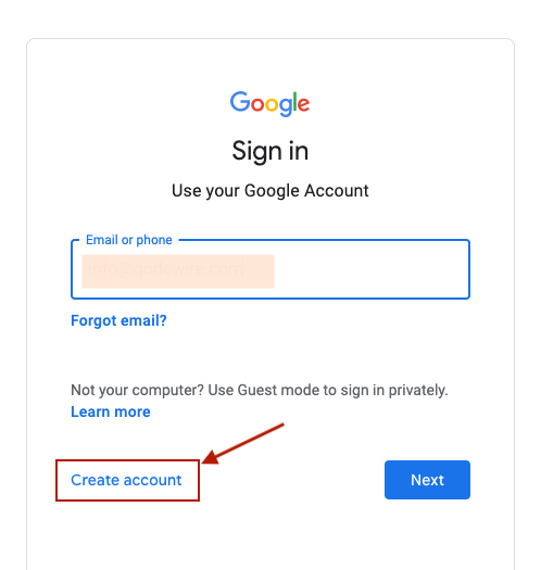 When you first access Google Ads, you will be prompted to login into your Google account. By default, this should be your Gmail email. But since we want to use our company email instead (custom domain email), click on “Create account”.
