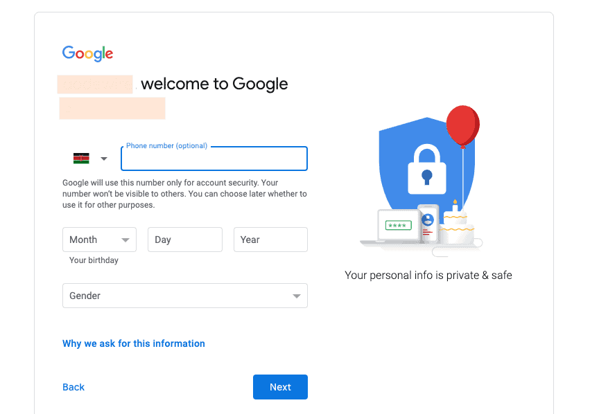 The last step before accessing your Google Ads account with your company email is to activate 2FA. This step is required to ensure the security of your account. Enter your phone number and date of birth and proceed to request another OTP via SMS or call.